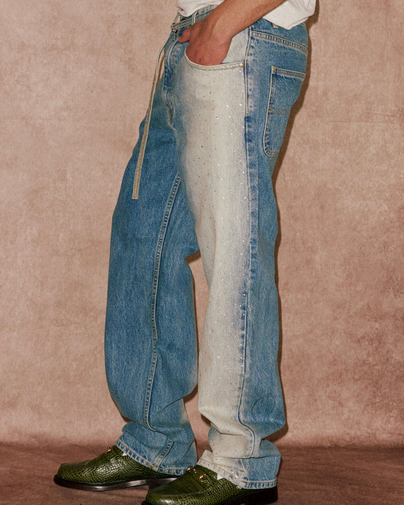 Fit: Sun Beam Jeans are cut to a loose unisex fit with a low to mid-waist, straight leg and regular length. Made of non stretch denim in light blue wash with a vintage finish.