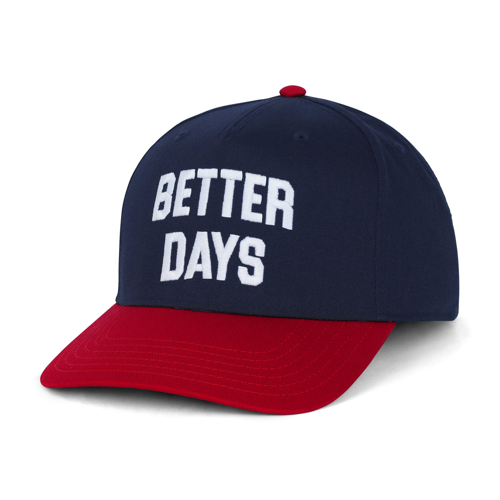 Finish: Navy hat with red bill and navy eyelets. White embroidery front, yellow sun embroidery back. Green underbrim.